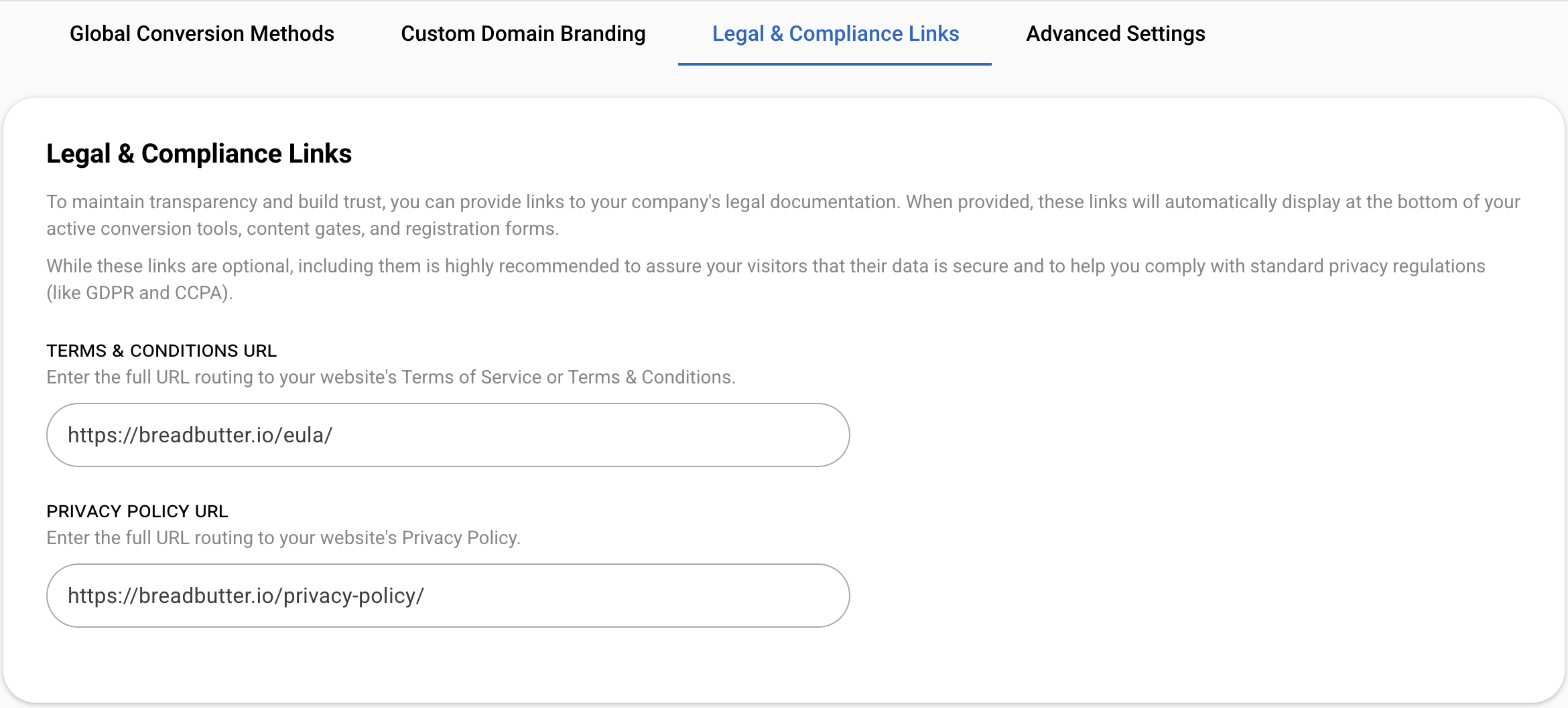 Step 1: Define Your Links Navigate to your global Bread and Butter Webapp Settings for Legal and Compliance. Here, you will paste the exact URLs for your specific Terms & Conditions and Privacy Policy, which should include your Cookie Notice. The widget automatically pulls these links to direct curious visitors to the right legal information.