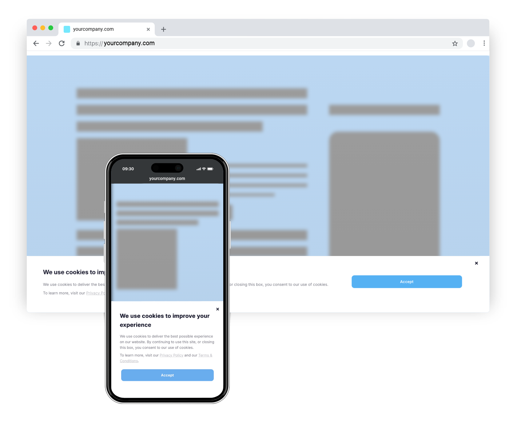 Tired of overly complicated compliance banners that frustrate your visitors, ruin your frictionless website experience, and clutter your beautiful design? Look no further. We built a beautifully streamlined, horizontal implied consent banner modeled after the world's leading enterprise websites.