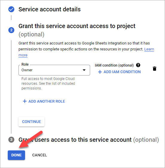 In the Select a role dropdown, choose Owner (or a role with sufficient Sheets access) and click Continue, then Done.
