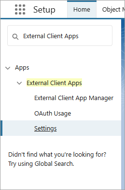 In the search bar in the left menu, enter External Client Apps, then select Settings.