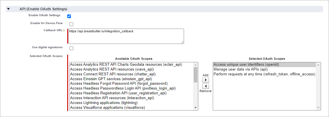 https://api.breadbutter.io/integration_callback - Selected OAuth Scopes: Add the following scopes:
