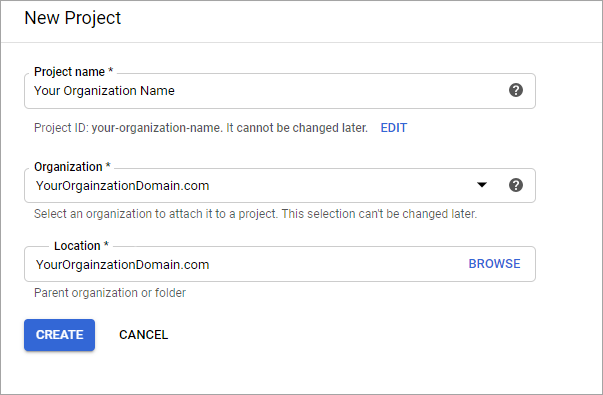 For the Project name, enter your company or website name. Ensure your Organization and Location are correctly selected, then click Create.