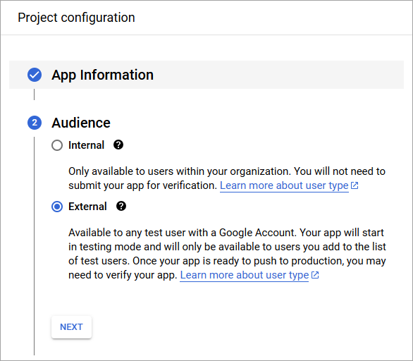 For Audience, choose External and click Next.