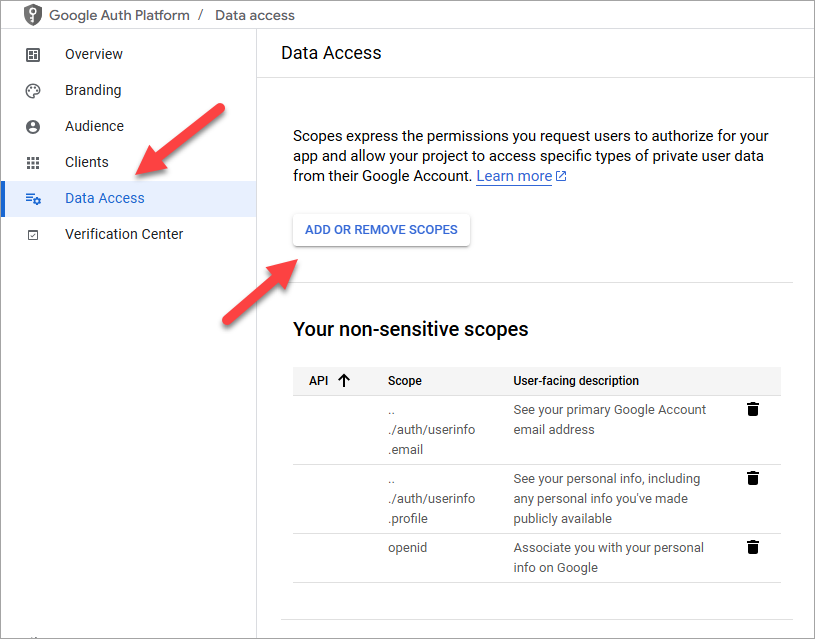 In the left menu, select Data Access. Click Add or Remove Scopes. Select (or manually add)