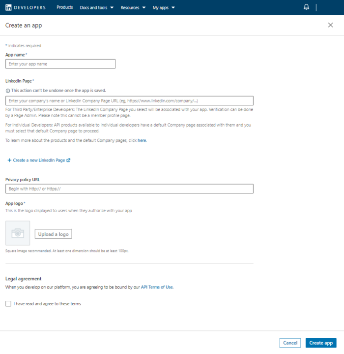 Agree to the Legal agreement, then click Create app.